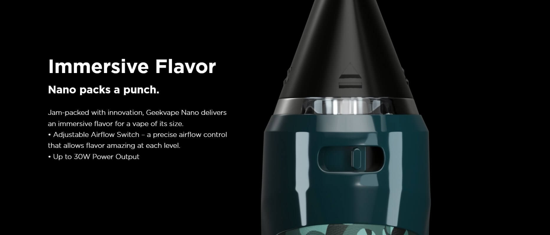 Максимальная мощность GeekVape Nano POD kit составляет 30 Вт, что снабжается встроенным аккумулятором емкостью 800 мАч. Этого достаточно для автономной работы в течение дня при среднем использовании. Для подзарядки аккумулятора используется разъем USB Type-C, расположенный на нижнем торце устройства и защищенный силиконовой заглушкой от влаги. Заряжание происходит током , обеспечивающим быстрое пополнение энергии. Устройство работает под управлением фирменного чипсета от GeekVape, автоматически регулирующего мощность в диапазоне от 5 до 30 Вт в зависимости от сопротивления установленного картриджа. Пользователь также может самостоятельно настраивать мощность с помощью единственной кнопки "fire", расположенной на боковой поверхности устройства. Небольшой монохромный дисплей вертикальной ориентации показывает основную информацию о работе устройства, включая уровень заряда аккумулятора, мощность, напряжение, сопротивление испарителю и количество затяжек.