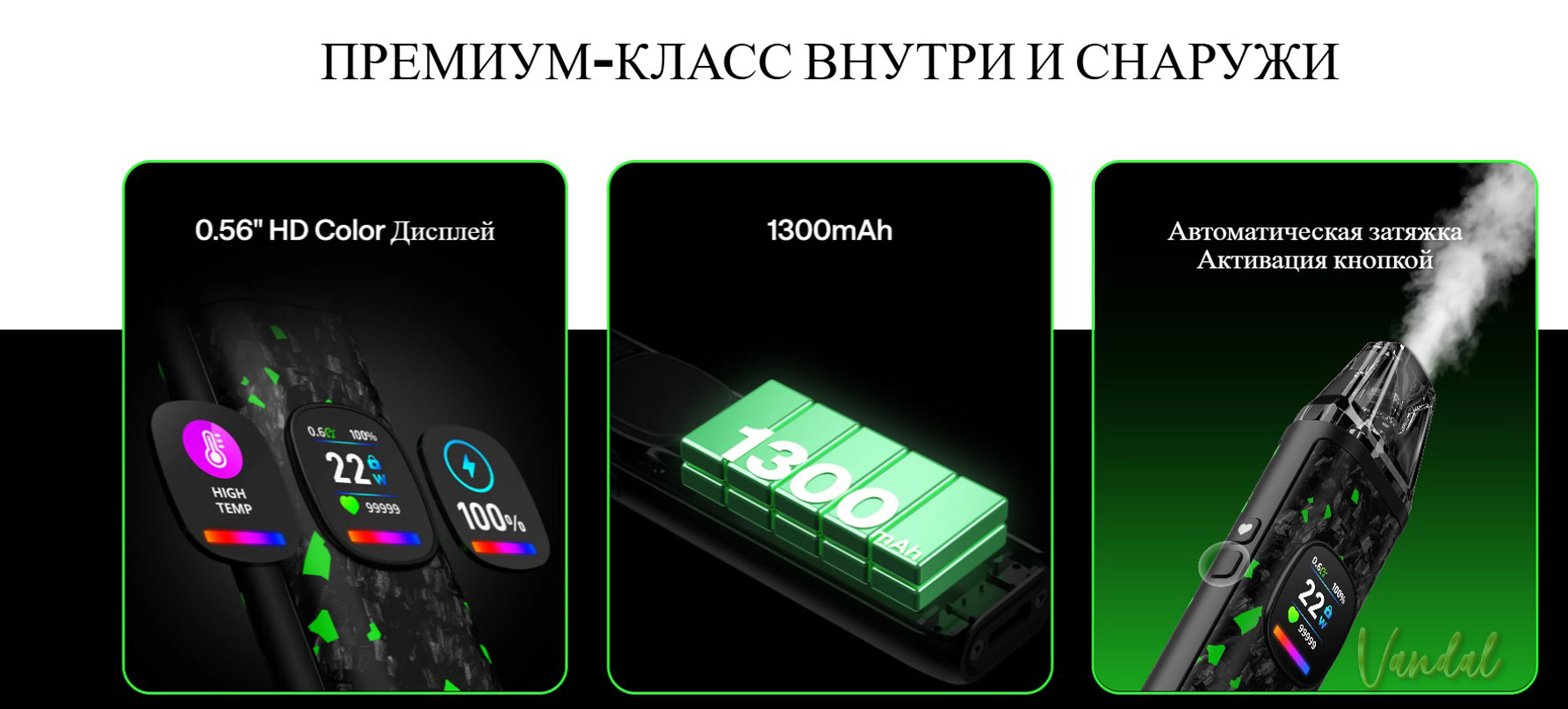 Вес в 67 граммов делает новинку чрезвычайно удобной в повседневном использовании: вы можете носить ее с собой куда угодно и не чувствовать дискомфорта. В новом девайсе улучшен и аккумулятор: с объемом 1300 мАч, он обеспечивает до 4 дней парения без подзарядки при среднем темпе использования – на 33% больше, чем у предшественника. Мощность устройства составляет 5-30 Вт, чего вполне достаточно для комфортного парения как для новичков, так и опытных пользователей.