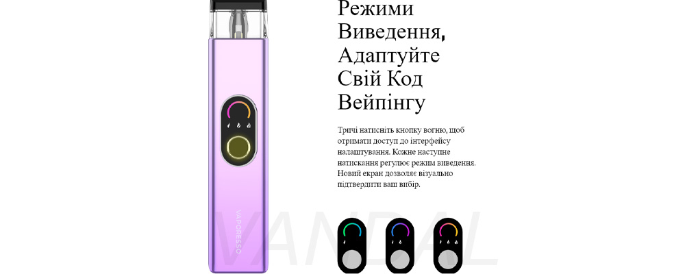 Цей девайс є простим у використанні, Vaporesso XROS 4 – це под-система, яка пропонує три режими роботи, для зручності позначені як перший, другий та третій. Перший режим забезпечує мінімальну потужність, тоді як третій – максимальну. Кожен режим має спеціальний світлодіодний індикатор. Дугова індикація, створена не одним діодом, а цілою групою світлодіодів, формує своєрідний екран для налаштування потужності та відображення рівня заряду акумулятора. На лицьовій стороні пристрою розташований екран із дугоподібним світлодіодним індикатором та кнопкою активації/керування. XROS 4 працює як від кнопки, так і від датчика затягування, що знаходиться по центру під майданчиком для картриджа. Функціонал кнопки простий і зображений на захисній плівці, яка покриває картридж до початку використання. П'ять швидких натискань включають або вимикають пристрій, чотири натискання блокують кнопку, щоб уникнути випадкових натискань, а три швидких натискання змінюють режим роботи. XROS 4 - це ідеальний вибір для тих, хто шукає зручний та функціональний вейп з можливістю гнучкого налаштування під свої потреби.