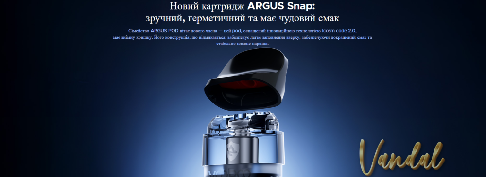 - Картриджі ARGUS Snap з iCOSM Code 2.0 гарантують чистий смак та стабільну подачу пари.